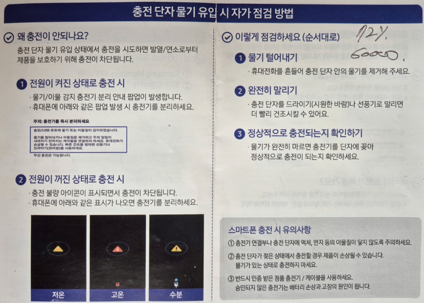 - 휴대폰을 가볍게 흔들어 충전 단자 내부의 물기를 제거