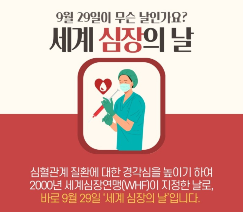 심혈관계 질환에 대한 경각심을 높이기 위하여 2000년 세계심장연맹(WHF)이 지정한 날로, 바로 9월 29일 ‘세계 심장의 날’입니다.
