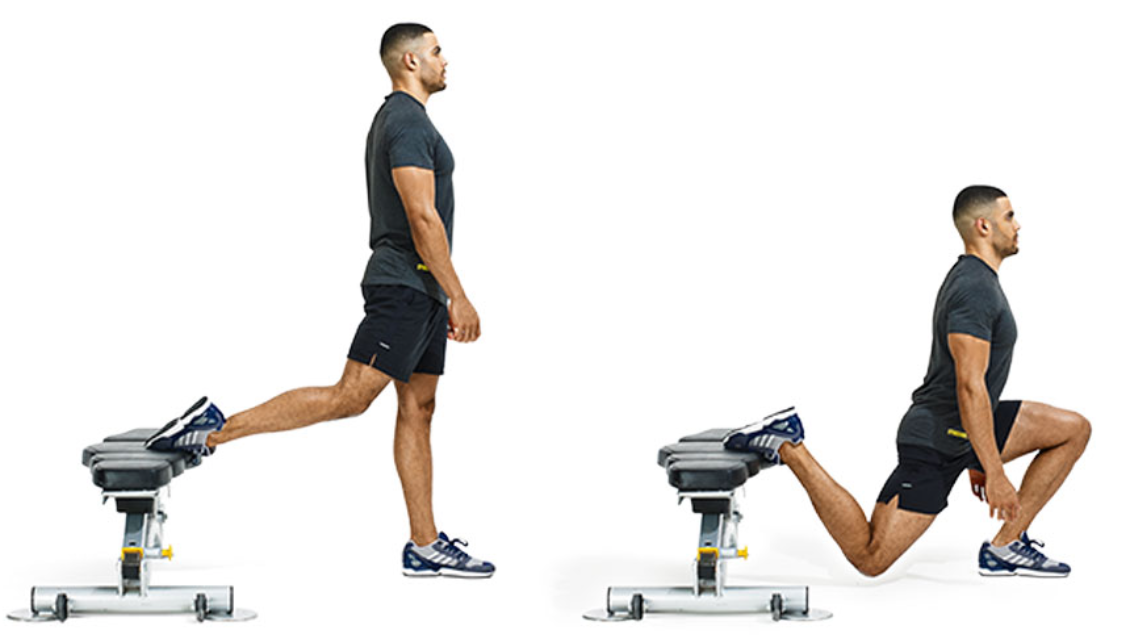 - 동작: 한쪽 발등을 벤치나 의자 위에 올리고, 앞쪽 다리로만 균형을 잡습니다. 앞쪽 무릎이 90도가 되도록 수직으로 앉습니다.