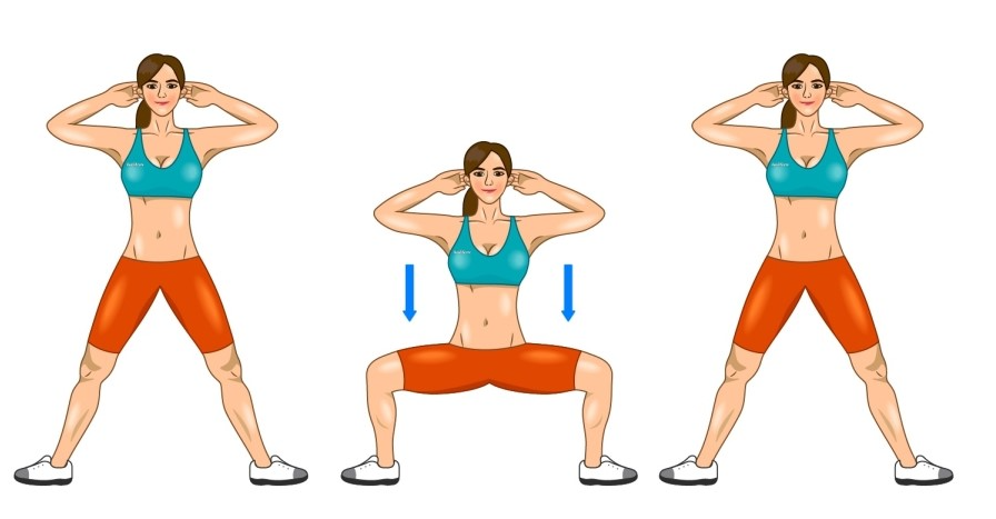 - 동작: 허벅지에 탄력 밴드를 끼우고 어깨너비보다 넓게 발을 벌립니다. 발끝을 바깥으로 향하게 하고 앉습니다.