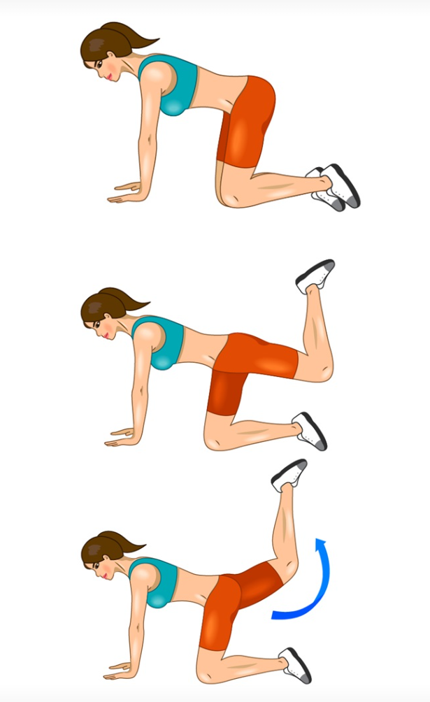 - 동작: 네 발 기기 자세에서 무릎을 90도로 유지하며 발바닥이 천장을 향하도록 다리를 들어 올립니다.