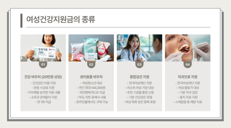 여성건강지원금은 크게 3가지 주요 축으로 나뉩니다. 내가 어떤 지원을 받을 수 있는지 먼저 확인하세요.