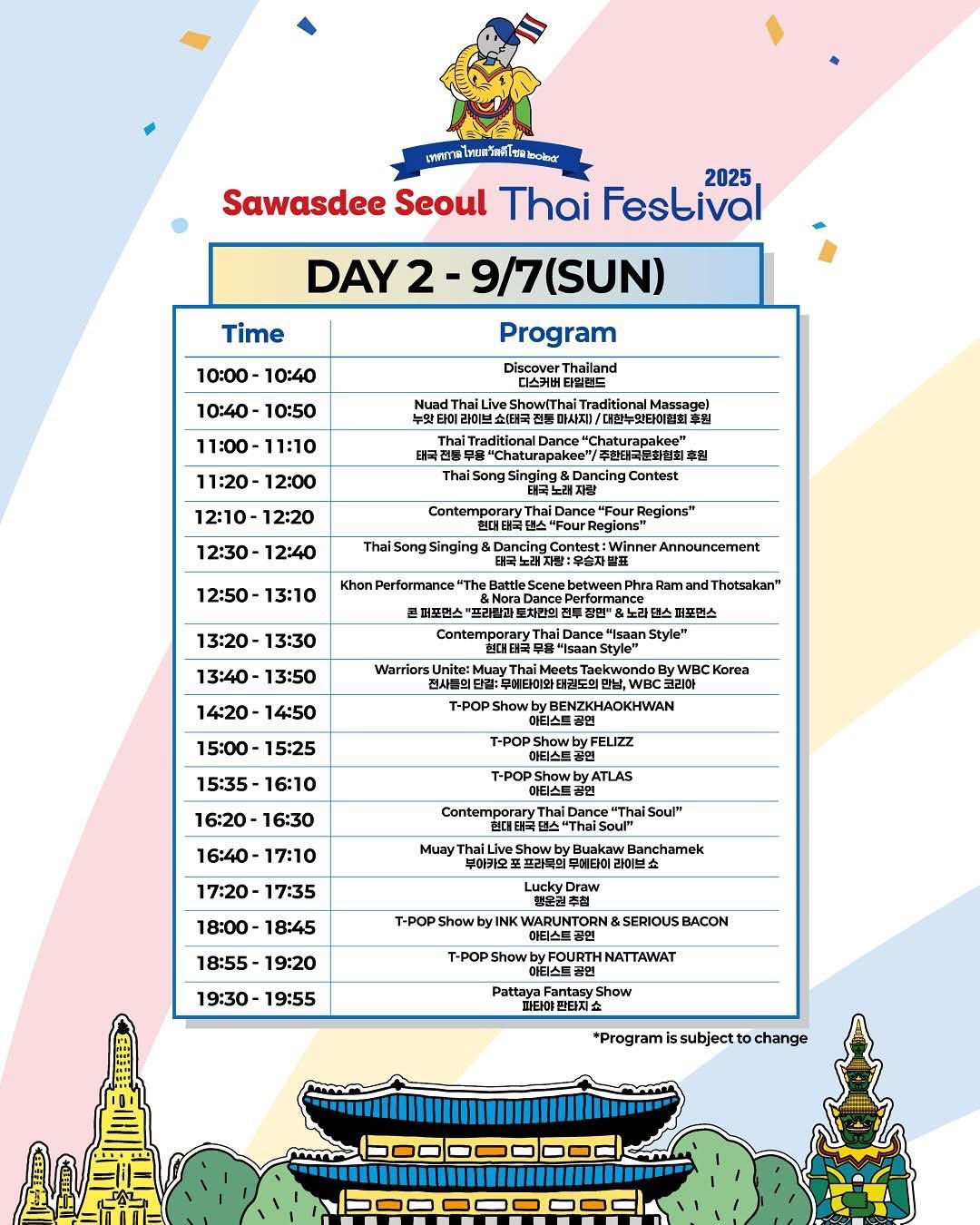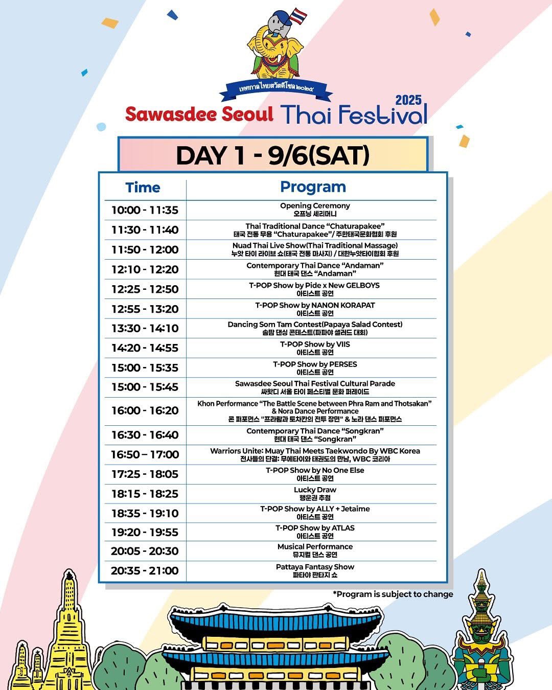 - 행사명: Sawasdee Seoul Thai Festival 2025 (싸왓디 서울 타이 페스티벌 2025)
